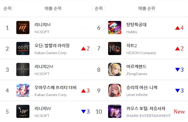 엔씨소프트(NC) '리니지M'이 1위 자리를 수성한 가운데 카카오게임즈의 '오딘: 발할라 라이징'이 23일 오후 9시를 기점으로 2위에 올랐다. 지난주 톱5에 들었던 즈룽게임즈 신작 '아르케랜드'는 8위로 순위가 소폭 하락했다.