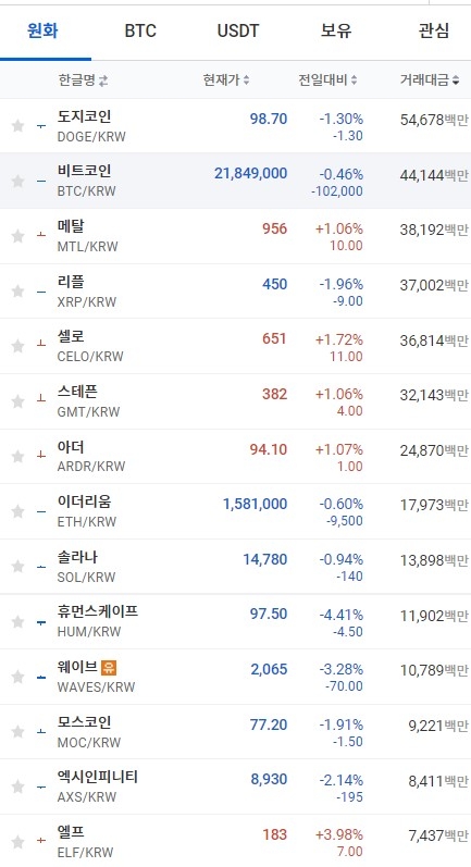 업비트에서 도지코인은 1.30% 내린 98.70원이었다.