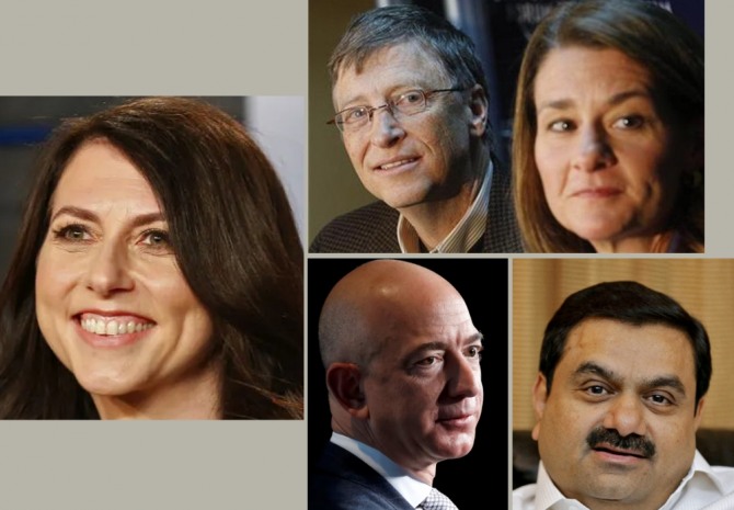 포브스가 꼽은 2022년 가장 주목할 ‘억만장자 기부천사들'. 매켄지 스콧(왼쪽부터 시계방향), 빌 게이츠, 멀린다 게이츠, 가우탐 아다니, 제프 베이조스. 사진=로이터
