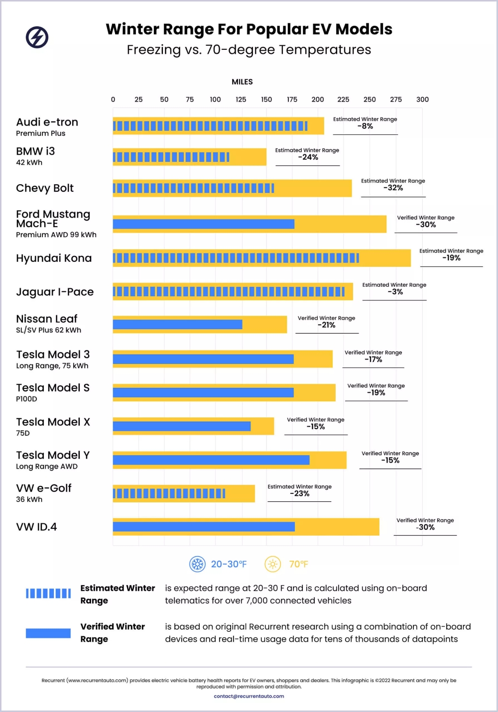 25일(현지시간) 자동차 전문매체 카스쿱스에 따르면 전기차 전문 조사업체 리커런트가 주요 전기차 10여종을 대상으로 동절기 주행거리를 최근 조사해 발표했다.