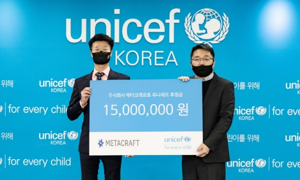 박태훈 메타크래프트 이사(왼쪽)와 김학수 국제연합아동기금(UNICEF) 한국위원회 후원본부 기업후원팀장. 사진=메타크래프트이미지 확대보기