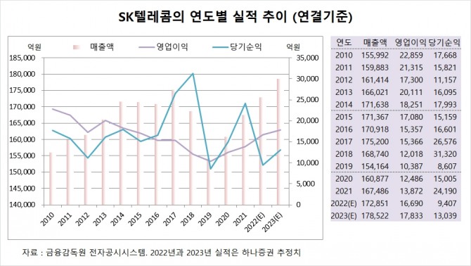 하나증권은 SK텔레콤의 올해 연결기준 매출액이 17조8522억원, 영업이익이 1조7833억원, 당기순이익이 1조3039억원에 달할 것으로 추정하고 있습니다.