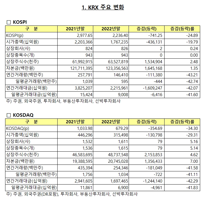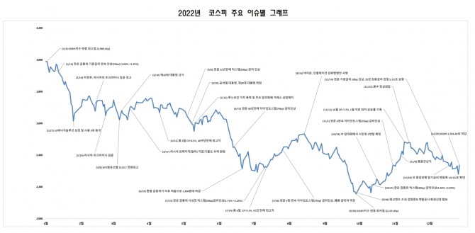 이후 지지부진하던 증시는 12월 들어 힘을 잃고 하락세를 이어간 끝에 12월 29일 한해동안 24.89%의 하락을 기록하며 2022년 증시도 막을 내렸다.