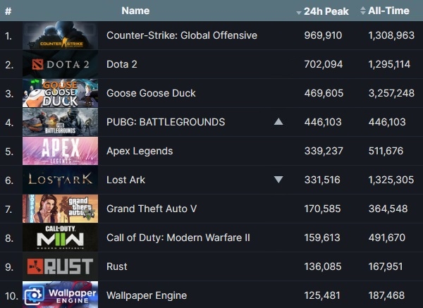 팀 포트리스 2의 주간 최다 동시 접속자 수는 9만682명이었다. 12위부터 15위까지는 프롬 소프트웨어 '엘든 링', 아이언게이트 '발헤임', 일렉트로닉 아츠(EA) '피파 23', 스튜디오 와일드카드 '아크: 서바이벌 이볼브드' 등이 차지했다.