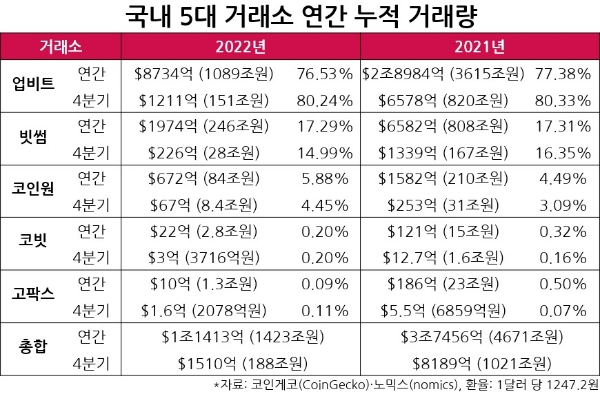 4분기 거래액만으로 좁혀 보면 5대 거래소의 누적 거래액은 188조원으로, 2021년 대비 81.59% 급감했다. 여기에는 11월 해외 대형 거래소 FTX의 파산 사태, 12월 국내 암호화폐 대장주로 꼽히는 위믹스가 5대 거래소에서 거래 지원이 종료된 것 등이 영향을 미친 것으로 파악된다.