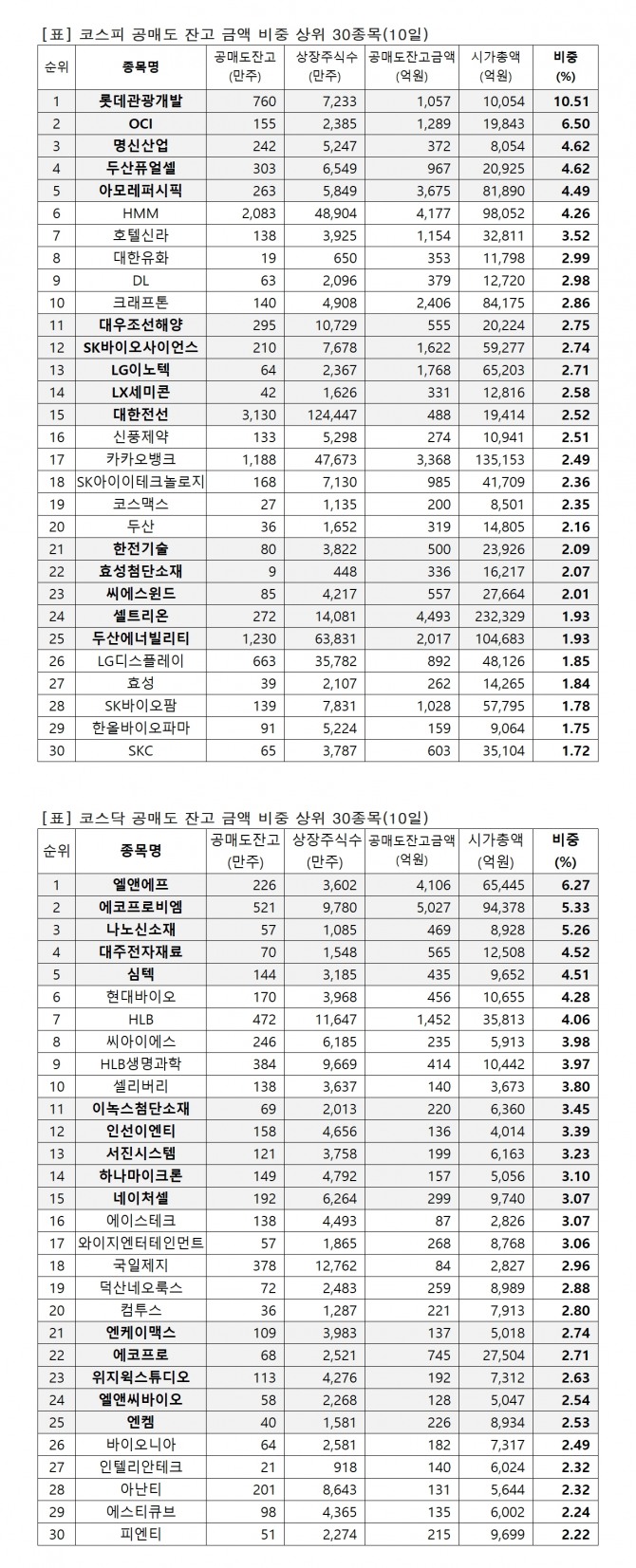 1위 롯데관광개발 1056억원(10.51%), 2위 OCI 1289억원(6.5%), 3위 명신산업 372억원(4.62%), 4위 두산퓨얼셀 967억원(4.62%), 5위 아모레퍼시픽 3675억원(4.49%), 6위 HMM 4176억원(4.26%), 7위 호텔신라 1154억원(3.52%), 8위 대한유화 352억원(2.99%), 9위 DL 379억원(2.98%), 10위 크래프톤 2405억원(2.86%), 11위 대우조선해양 555억원(2.75%), 12위 SK바이오사이언스 1621억원(2.74%), 13위 LG이노텍 1767억원(2.71%), 14위 LX세미콘 330억원(2.58%), 15위 대한전선 488억원(2.52%),