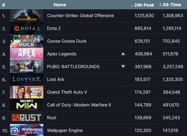 일렉트로닉 아츠(EA) '에이펙스 레전드'와 크래프톤 '펍지: 배틀그라운드' 사이 순위 변동이 있었던 것 외 최다 동시 접속 톱10 게임 간의 변동은 없었다. 11위는 동시 접속 11만1913명을 기록한 넷이즈의 '나라카: 블레이드 포인트'가 차지했다.