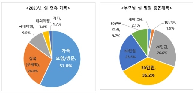 ‘올해 세뱃돈 적정금액’은 초등학생 이하 3만원, 중학생 5만원, 고등학생 및 대학생 10만원이라는 답변이 가장 많았다.