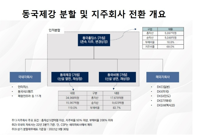 분할하는 3개 회사의 경우 △‘동국홀딩스’는 그룹 전략적 컨트롤타워로서 사업회사의 중장기 미래성장동력 발굴 및 사업 포트폴리오를 조정하는 임무를 수행하고 △‘동국제강’은 철 스크랩(고철)을 재활용하는 전기로 제강 사업을 강화해 탄소중립 이슈에 적극적으로 대응하는 친환경 성장전략을 추진하며 △‘동국씨엠’은 핫코일(열연)을 원료로 냉간압연을 통한 표면처리 전문기업으로 세계 최고 경쟁력의 컬러강판 사업의 고도화를 추구한다. 지주사 체제로 전환이 완료되면 동국홀딩스가 동국제강과 동국씨엠은 물론 그룹의 모든 국내외 자회사를 지배하게 된다.