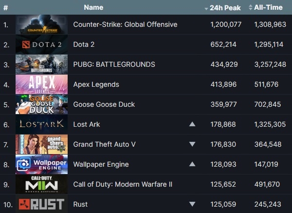 국산 게임 중 3위 크래프톤 '펍지: 배틀그라운드', 6위 스마일게이트 '로스트아크' 외에도 위메이드 '미르4'가 동시 접속 3만5515명으로 48위, 펄어비스 '검은 사막'이 2만4348명으로 67위를 차지했다.
