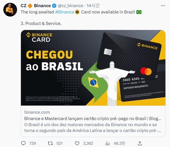 바이낸스에 따르면 브라질은 이 회사의 10대 시장 중 하나로, 암호화폐 지원 선불 카드를 통해 자국내 신규 및 기존 사용자가 마스터카드 가맹점에서 청구서를 지불하고 암호화폐로 쇼핑할 수 있게 된다.