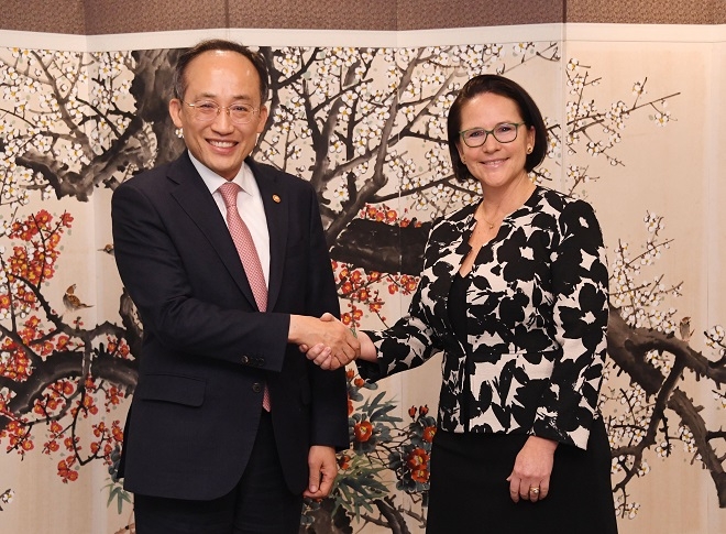 이미지 확대보기이날 유리코 베케스 룩셈부르크 재무장관은 추경호 경제부총리를 오후 4시에 만났다. 추경호 경제부총리는 유리코 베케스 장관과 두 나라의 녹색금융 협력 방안에 대해 대화했다.