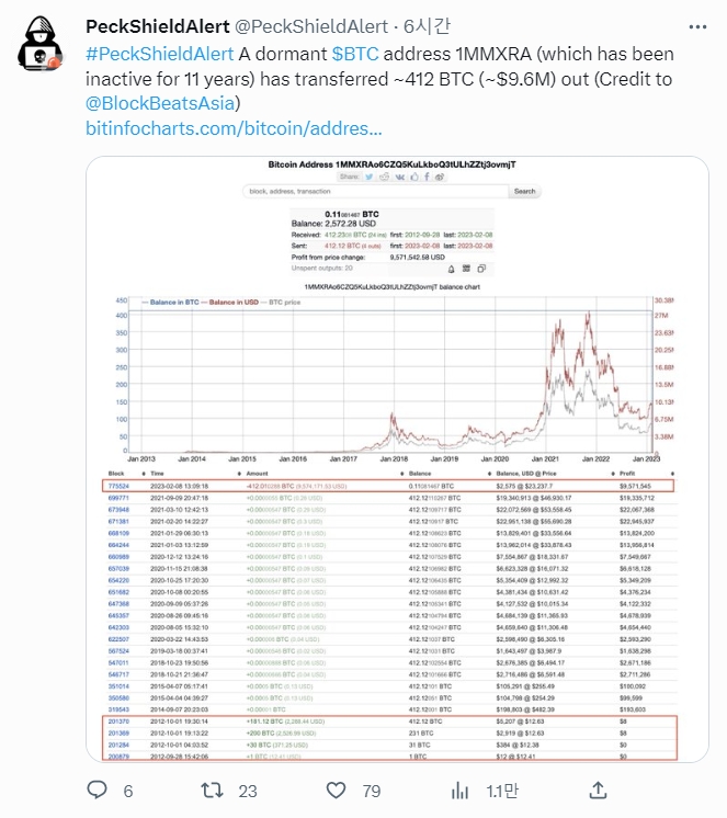 2012년 9월 412.23 BTC를 구매한 이 비트코인 주소는 약 11년 만에 처음으로 전송돼 암호화폐 커뮤니티 회원들의 주목을 받고 있다.