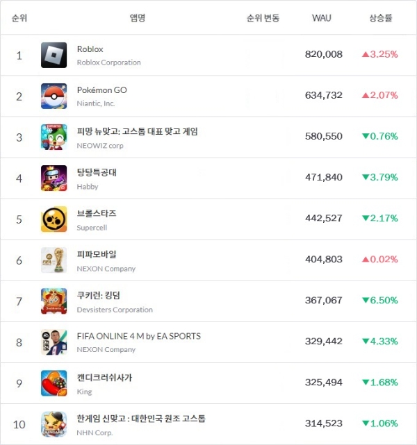 2월 2주차 WAU 톱10 게임 중 가장 높은 수익을 거둔 것은 매출 6위 '피파 모바일'이었다. 그 외에도 '로블록스'가 8위, '피파 온라인 4M'이 10위, '탕탕특공대'가 19위, '쿠키런: 킹덤'이 34위 등을 차지했다.