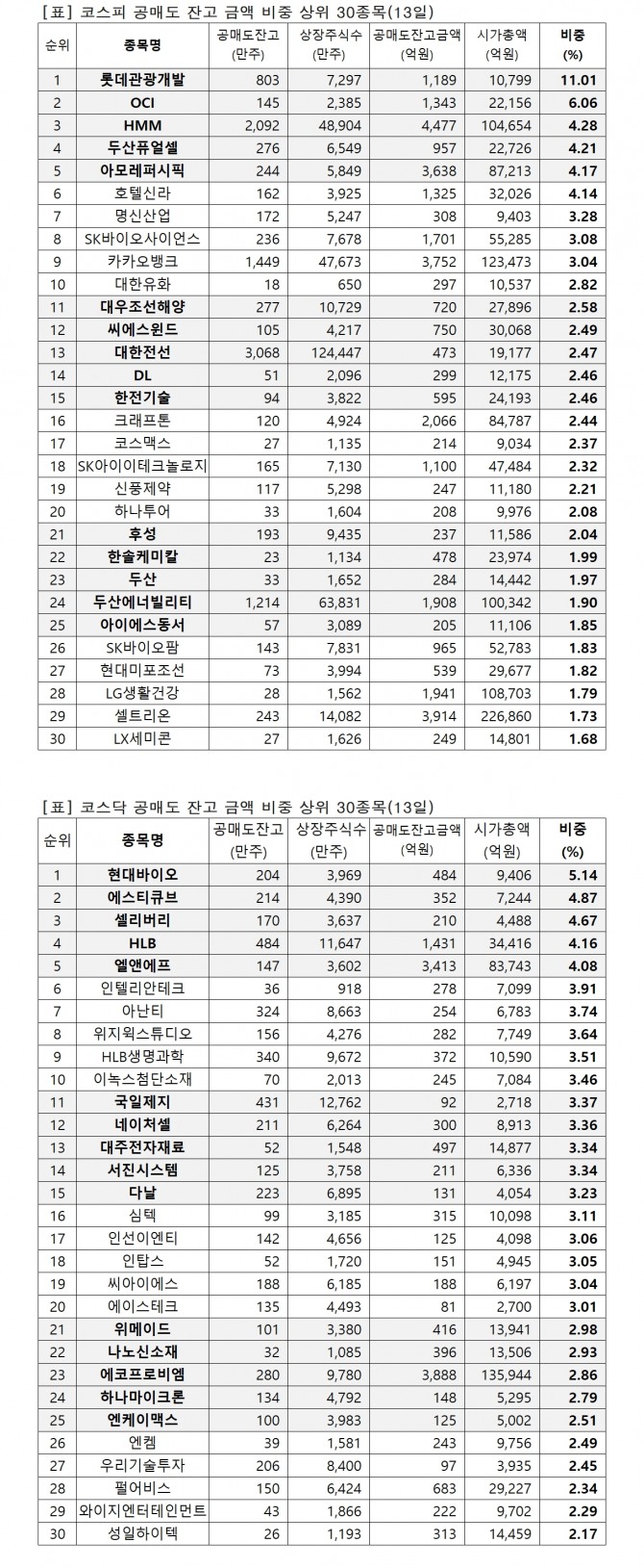 이미지 확대보기16일 한국거래소에 따르면 지난 13일 기준 유가증권시장과 코스닥시장에서 시가총액 대비 공매도 잔고금액 비중 상위 종목은 다음과 같다.