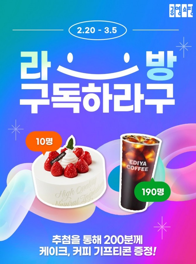 ‘라방 구독하라구’ 이벤트도 함께 진행한다. 공영몰 내 공영라방 페이지를 구독하는 고객 대상 이벤트다. 오는 20일부터 시작하는 이번 이벤트는 공영몰 메인페이지→공영라방탭으로 들어가 오른쪽 하단에 있는 구독 버튼을 누르거나 공영라방 예고화면의 +구독 버튼을 누르고 3월5일까지 구독을 유지하면 자동으로 응모된다. 추첨을 통해 케이크 10명, 커피쿠폰 190명, 총 200명의 고객에게 기프티콘을 제공한다.