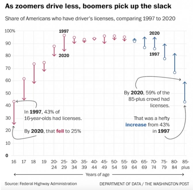 WP 보도의 결론은 현재 11~27세에 해당되는 세대를 대체로 일컫는 미국의 Z세대 사이에서 이전 세대와는 다르게 차를 직접 몰지 않으려는 경향이 강하다는 사실이 확인됐다는 것.