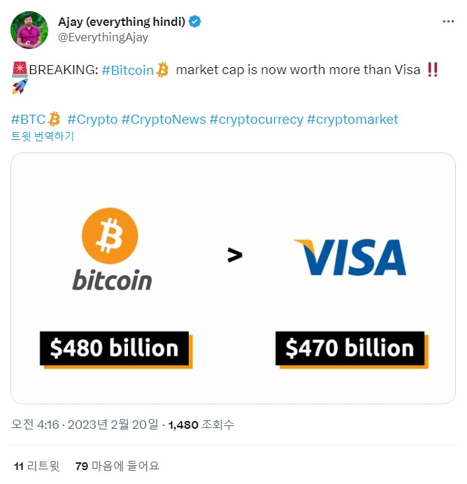 2023년 들어 랠리를 펼친 비트코인은 완전히 회복되어 지난해 11월 6일 시가총액 4080억달러에서 최근 추가로 650억달러를 쌓아 올려 결제 처리 대기업 비자를 또다시 추월했다.