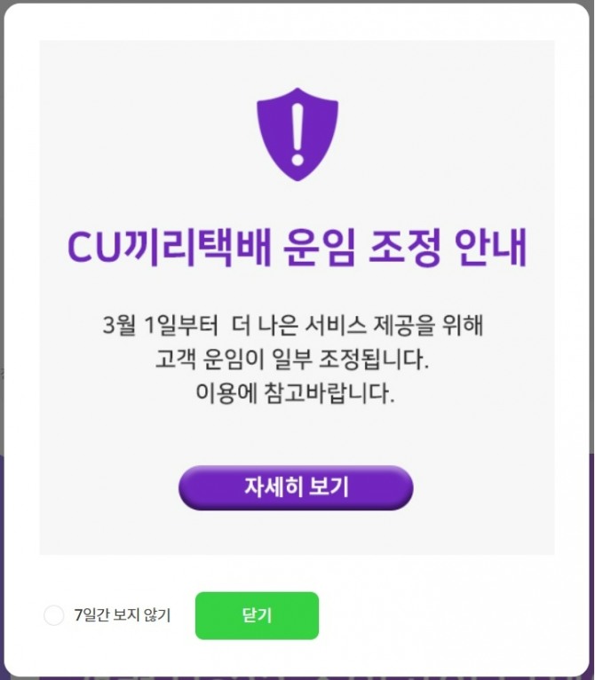 이미지 확대보기BGF리테일이 운영하는 편의점 CU끼리택배 운임이 내달부터 조정된다.