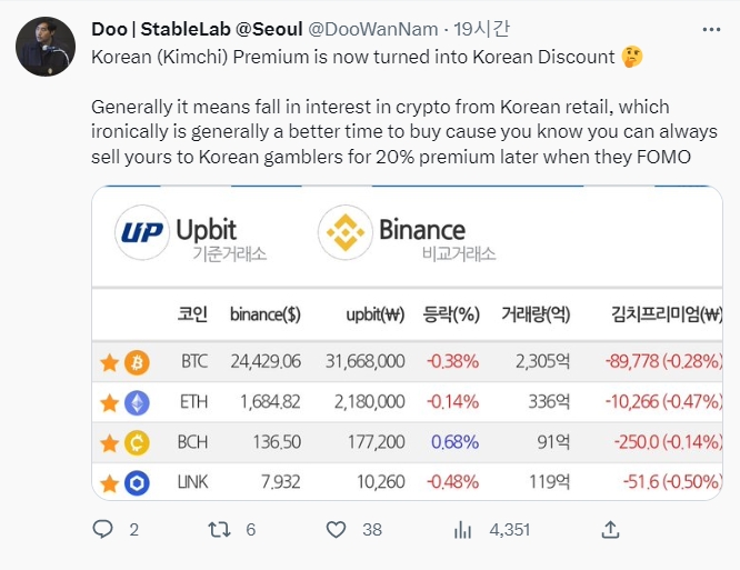 노드검증업체이자 벤처캐피털 펀드인 스테이블노드(Stablenode)의 남두완 최고운영책임자(COO)에 따르면 '김치 프리미엄'이 '할인(Korean Discount)'으로 바뀐 것은 비트코인에 대한 국내 개인투자자들의 관심이 떨어졌음을 의미한다.