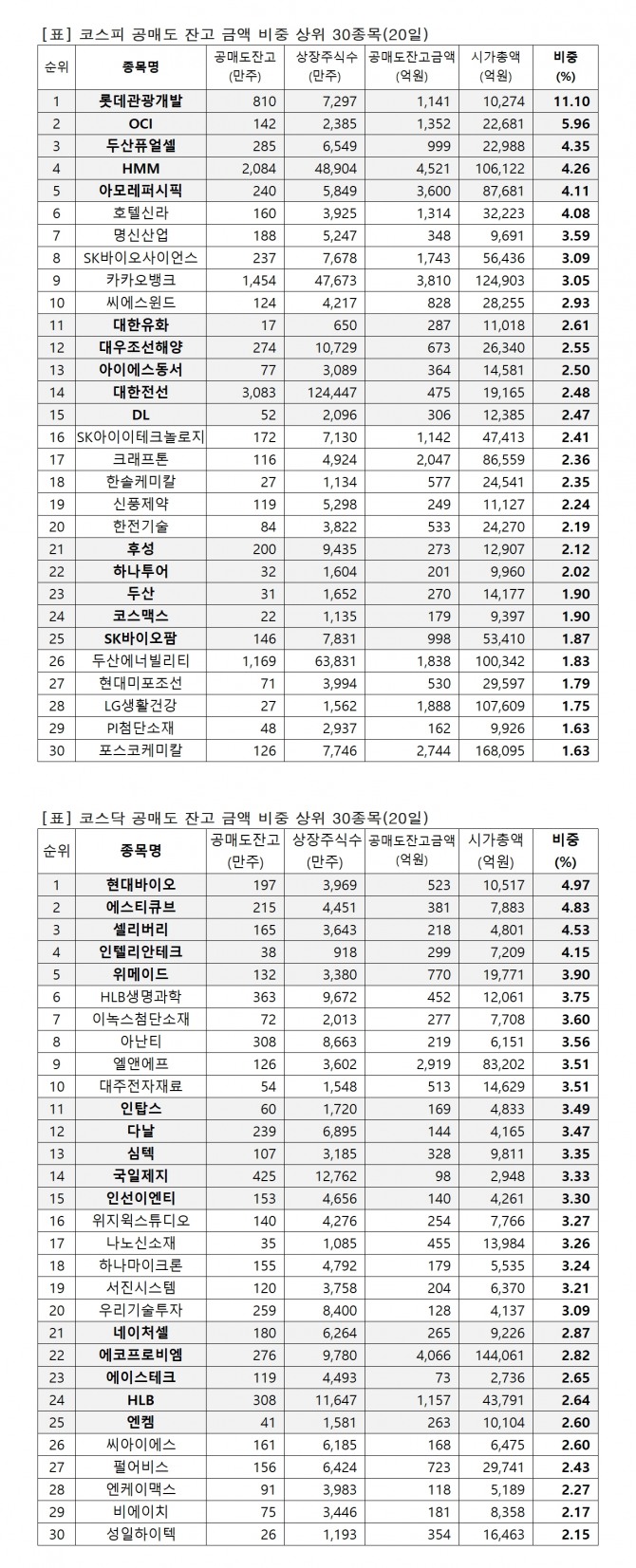 1위 롯데관광개발 1140억원(11.1%), 2위 OCI 1352억원(5.96%), 3위 두산퓨얼셀 999억원(4.35%), 4위 HMM 4521억원(4.26%), 5위 아모레퍼시픽 3600억원(4.11%), 6위 호텔신라 1314억원(4.08%), 7위 명신산업 347억원(3.59%), 8위 SK바이오사이언스 1742억원(3.09%), 9위 카카오뱅크 3809억원(3.05%), 10위 씨에스윈드 828억원(2.93%), 11위 대한유화 287억원(2.61%), 12위 대우조선해양 672억원(2.55%), 13위 아이에스동서 364억원(2.5%), 14위 대한전선 474억원(2.48%), 15위 DL 306억원(2.47%),