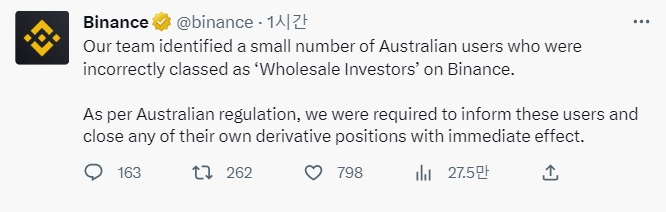 바이낸스는 이날 트위터를 통해 "우리 팀은 바이낸스에서 '도매 투자자'로 잘못 분류된 소수의 호주 사용자를 식별했습니다. 호주 규정에 따라, 우리는 이러한 사용자들에게 알리고 그들 자신의 파생적 위치를 즉시 폐쇄하도록 요구했습니다"라고 알렸다.