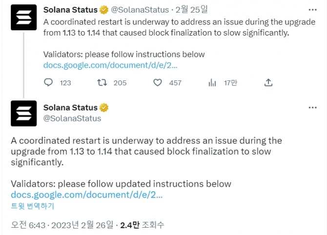 솔라나 스테이터스(Solana Status) 업데이트 웹 사이트에는 이 문제를 '클러스터 불안정성'이라고 지칭하며 블록 최종화를 가속화하기 위해 조정된 재시작이 시작되었음을 시사했다.