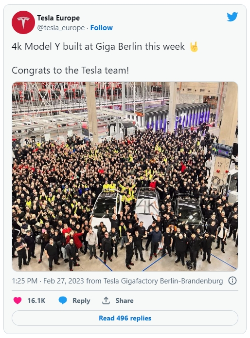 일렉트렉에 따르면 테슬라 유럽법인은 이날 트위터에 올린 공지문을 통해 기가팩토리4의 주간 생산량이 처음으로 4000대를 넘어섰다고 밝혔다. 기가팩토리4에서는 현재 테슬라 모델Y만 조립하고 있다.
