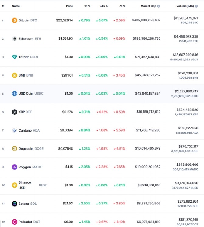 이미지 확대보기5일 오전 10시 20분 현재 글로벌 암호화폐 시세 추적사이트 코인마켓캡에서 비트코인(BTC)은 24시간 전 대비 0.67% 올라 2만2529.14달러에 거래됐다. 비트코인은 장중 한때 최저 2만2198달러까지 떨어졌으나 회복되기 시작해 최고 2만2569달러까지 치솟았다.