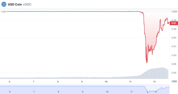이미지 확대보기암호화폐 통계 사이트 코인마켓캡에 따르면 미국 현지 시각 기준 11일, 미국 달러와 같은 가격을 유지하는 것을 목표로 한 USDC의 페깅(가치 고정)이 붕괴돼 한때 86센트까지 가격이 떨어졌다. 12일로 넘어오며 가격은 95달러대로 회복됐으나, 1달까지 오르진 못하며 오르내리고 있다.