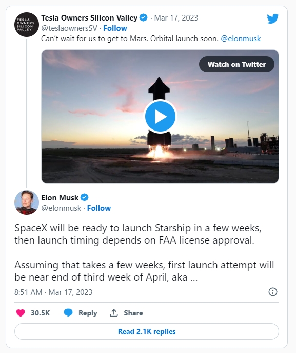 18일(이하 현지시간) 더스트리트에 따르면 머스크는 이날 올린 트윗에서 “미 연방항공청(FAA)의 승인이 떨어지는대로 정확한 발사 일정이 나올 것”이라고 전제한 뒤 “승인이 이뤄지는데 몇주 정도가 걸릴 것으로 보이지만 아마도 4월 마지막 주 쯤에 발사가 가능할 것으로 보인다”고 밝혔다.