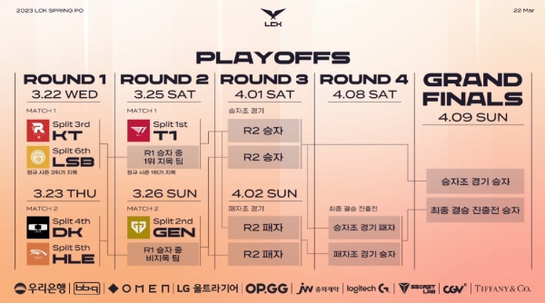 첫 라운드에는 정규시즌 3위팀 'KT 롤스터'와 6위팀 '리브 샌드박스', 4위팀 '디플러스 기아'가 5위팀 '한화생명 e스포츠'와 맞붙는다. 1라운드에서 살아남은 두 팀과 1위 'T1', 2위 '젠지 e스포츠' 등 4개 팀은 2라운드부터 5라운드까지는 두번 패배한 팀이 탈락하는 '듀얼 토너먼트' 형태로 맞붙게 된다.