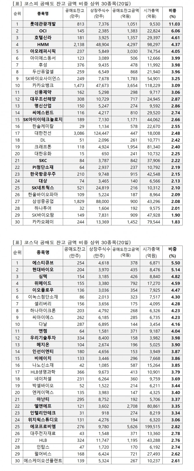 이미지 확대보기23일 한국거래소에 따르면 지난 20일 기준 유가증권시장과 코스닥시장에서 시가총액 대비 공매도 잔고금액 비중 상위 종목은 다음과 같다.