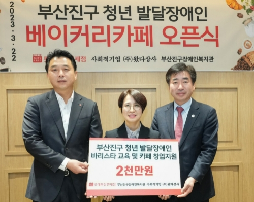 롯데면세점은 이번 카페 오픈을 기념해 부산진구장애인복지관에 청년 발달 장애인 바리스타 교육 훈련을 위한 후원금 2000만 원을 기부했다. 부산진구장애인복지관은 복지관 소속 장애인 가족과 직원들이 함께 사회적기업 왔다상사를 설립하고 2017년부터 장애인 자립을 위한 커피, 제과제빵 전문 매장을 운영하고 있다. 지난 2022년 1호점을 개점했으며 롯데면세점 부산점과 손잡고 2호점을 열었다.