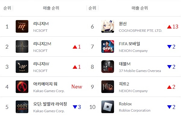 아키에이지 워와 더불어 카카오게임즈의 '오딘: 발할라 라이징'이 5위로 순위가 하락, 엔씨소프트(NC) '리니지' 3부작이 다시 한 번 매출 톱3를 석권했다. 전주 매출 5위였던 넥슨 '피파 모바일'은 7위에 자리잡았다.