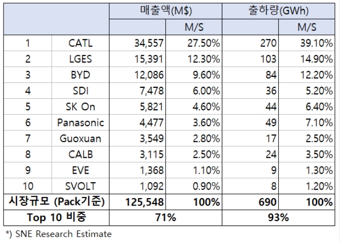 매출액 기준 1위는 중국 CATL로 전체 28%를 차지했다. 2위는 12%를 차지한 LG에너지시솔루션이었다, BYD(9.6%), 삼성SDI(6%), SK온(4.6%), 파나소닉(3.6%) 등이 뒤를 이었다. 출하량에서는 CATL, LG에너지솔루션, BYD가 매출액 순위와 동일한 1~3위를 기록했다. 하지만 SK온(6.4%)과 삼성SDI(5.2%)는 5위와 6위로 순위가 바뀌었다.