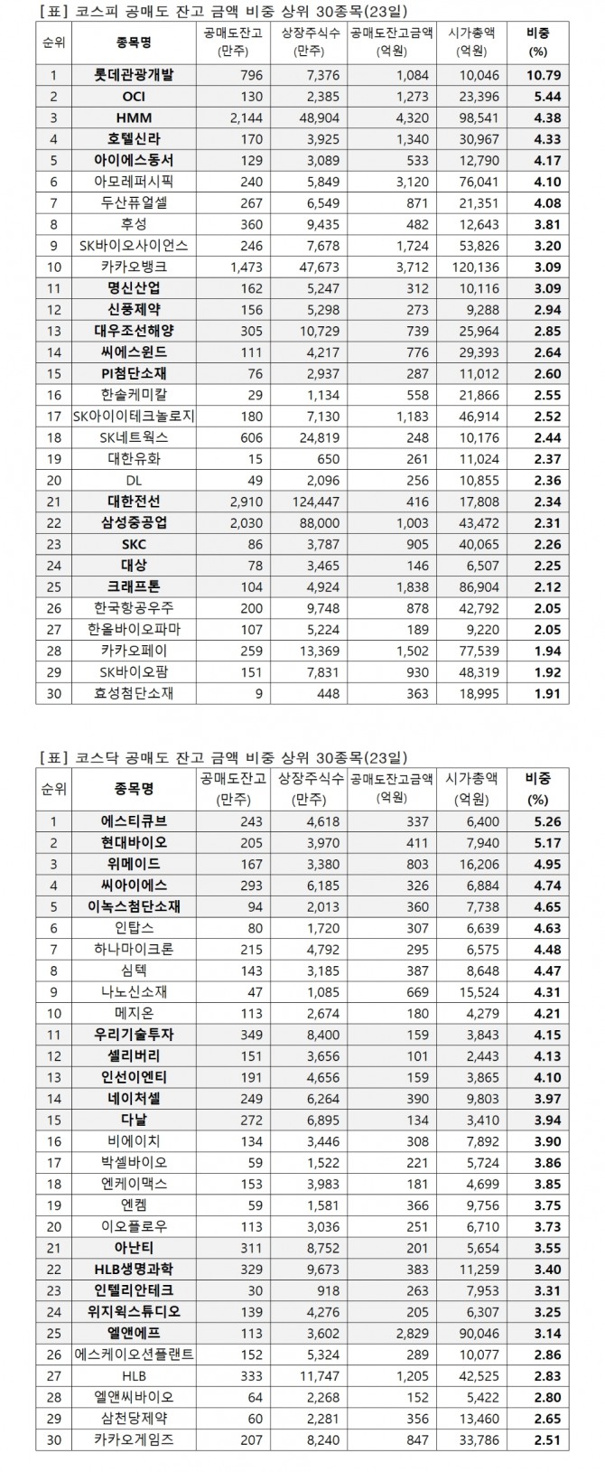 이미지 확대보기유가증권시장 시가총액 대비 공매도 잔고금액 비중(23일)