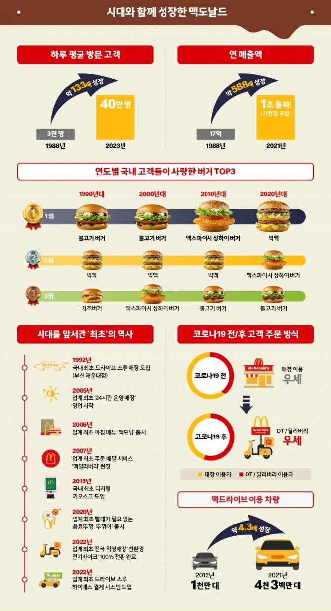 ‘최초’라는 수식어도 따라다녔다. 맥도날드는 1992년 국내 최초로 드라이브 스루(DT)인 ‘맥드라이브’를 선보였으며, 2005년에는 업계 최초로 24시간 매장 운영을 시작했다. 이어 2006년에는 업계 최초 아침 메뉴 ‘맥모닝’을, 이듬해인 2007년에 배달 주문 플랫폼 ‘맥딜리버리’를 도입했다. 최근에는 드라이브 스루 고객을 위한 하이패스 결제 시스템 도입 디지털 혁신에도 나서고 있다.