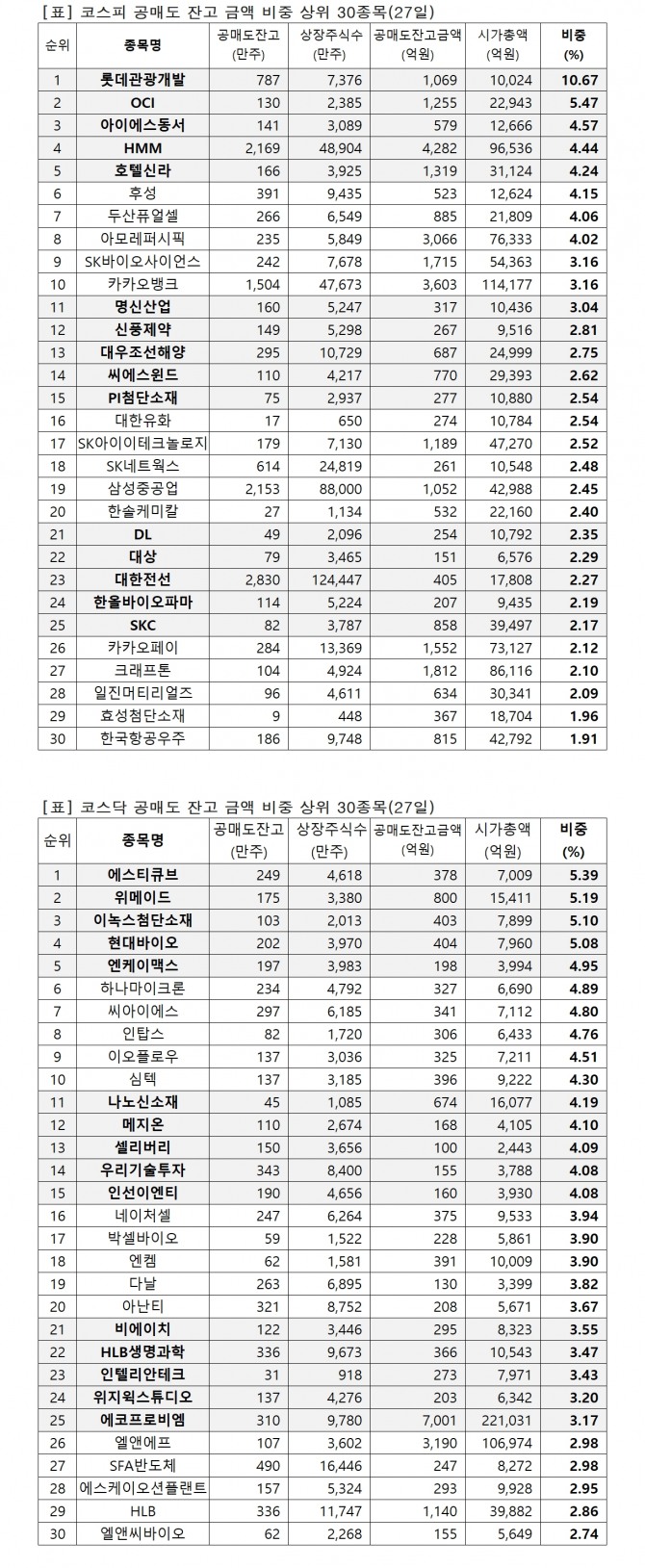 이미지 확대보기유가증권시장 시가총액 대비 공매도 잔고금액 비중(27일)