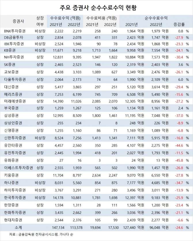 글로벌이코노믹이 조사한 국내 주요 증권사 27곳의 지난해 순수수료수익은 9조6048억원으로 전년의 12조7440억원에 비해 24.6% 감소한 것으로 나타났습니다.