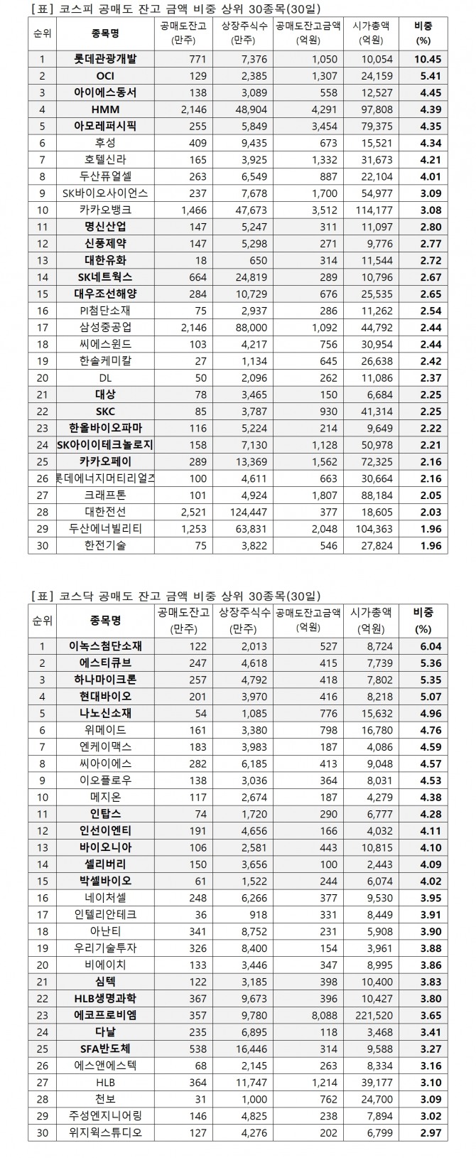 이미지 확대보기4일 한국거래소에 따르면 지난 30일 기준 유가증권시장과 코스닥시장에서 시가총액 대비 공매도 잔고금액 비중 상위 종목은 다음과 같다.