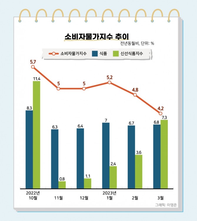 3월 소비자물가 상승률이 4% 초반으로 둔화…외식·가공식품 상승폭 여전