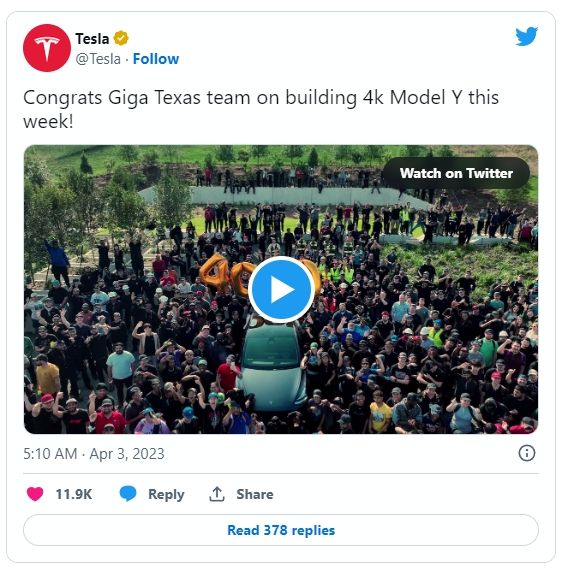 4일(이하 현지시간) 일렉트렉에 따르면 테슬라는 전날 트위터에 올린 공지문을 통해 기가팩토리5의 모델Y 생산량이 주간 기준으로 4000대를 넘었다고 밝혔다. 지난해 12월 3000대를 돌파한 지 세달만에 주간 생산량이 1000대 증가한 셈이다.