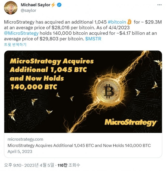 이 소식은 5일 마이클 세일러 마이크로스트레티지 회장의 트윗을 통해 발표됐다.