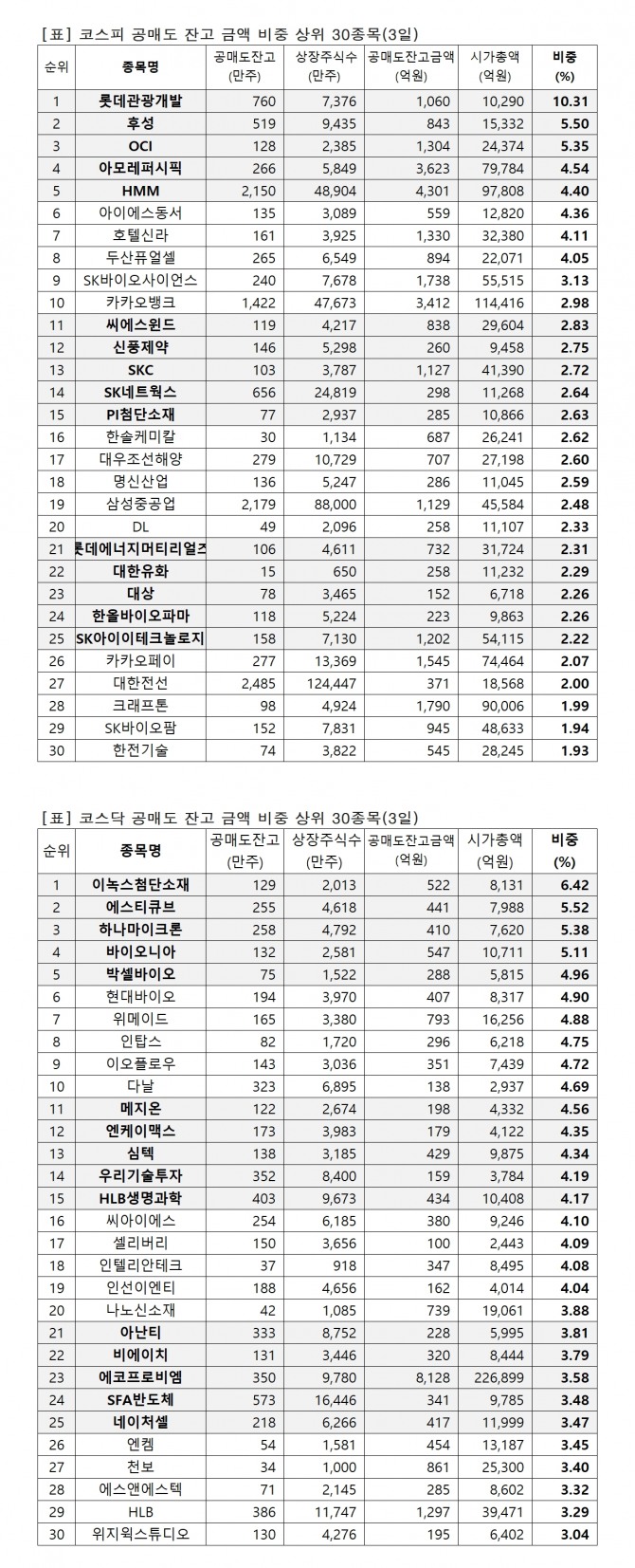 6일 한국거래소에 따르면 지난 3일 기준 유가증권시장과 코스닥시장에서 시가총액 대비 공매도 잔고금액 비중 상위 종목은 다음과 같다.