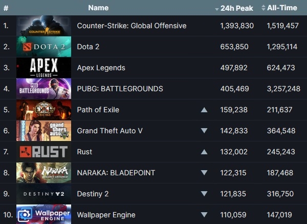 스팀 운영사 밸브 코퍼레이션(이하 밸브) '카운터 스트라이크'와 크래프톤 '펍지: 배틀그라운드' 등 1위부터 4위까지 순위 변동은 없었다. 전주 8위 액티비전 '콜 오브 듀티: 모던 워페어 2' 리마스터판은 가이진 엔터테인먼트 '워 썬더', 스마일게이트 '로스트아크', 밸브 '팀 포트리스 2' 등에 밀려 14위에 자리잡았다.