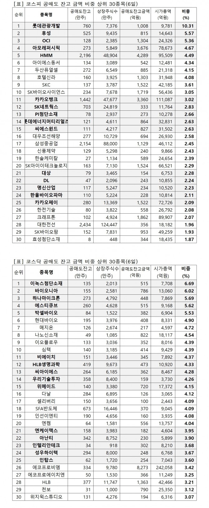 11일 한국거래소에 따르면 지난 6일 기준 유가증권시장과 코스닥시장에서 시가총액 대비 공매도 잔고금액 비중 상위 종목은 다음과 같다.