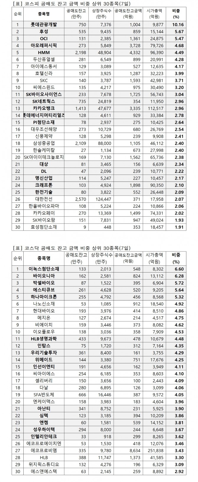 1위 롯데관광개발 1003억원(10.16%), 2위 후성 859억원(5.67%), 3위 OCI 1361억원(5.47%), 4위 아모레퍼시픽 3727억원(4.68%), 5위 HMM 4331억원(4.49%), 6위 두산퓨얼셀 899억원(4.28%), 7위 아이에스동서 527억원(4.17%), 8위 호텔신라 1286억원(3.99%), 9위 SKC 1593억원(3.71%), 10위 씨에스윈드 974억원(3.2%), 11위 SK바이오사이언스 1725억원(3.04%), 12위 SK네트웍스 354억원(2.96%), 13위 카카오뱅크 3334억원(2.96%), 14위 롯데에너지머티리얼즈 929억원(2.78%), 15위 PI첨단소재 275억원(2.64%),