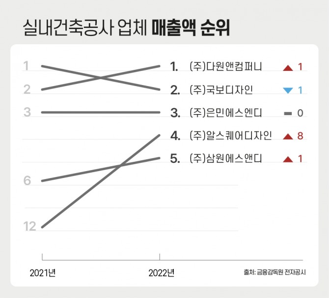 업계 관계자는 “기업과 기업 간(B2B) 거래가 중심이라 상대적으로 정적인 인테리어 공사 시장에서 눈에 띄는 기업들의 실적 변화가 크다”며 “전통의 강자인 국보·다원·은민 등과 신진 업체인 알스퀘어 등이 벌어지는 경쟁이 흥미롭다”고 말했다.