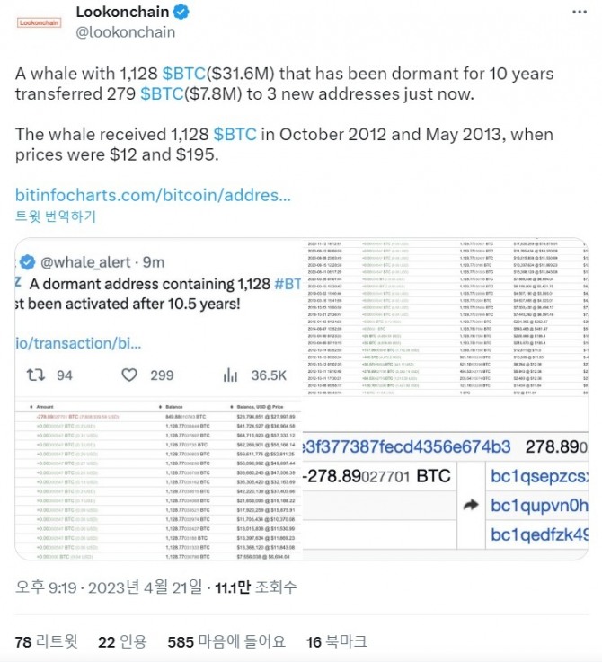 블록체인 추적 기업 룩온체인은 이날 트윗을 통해 문제의 고래가 2012년 10월과 2013년 5월에 각각 12달러와 195달러의 가격으로 1128 BTC를 받았다고 밝혔다. 이 고래는 총 3160만 달러의 BTC를 보유하고 있다.